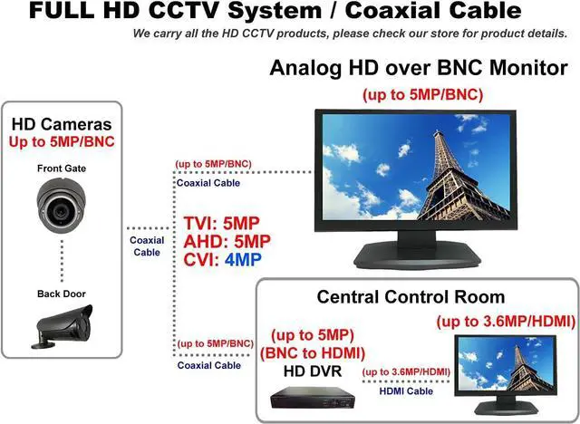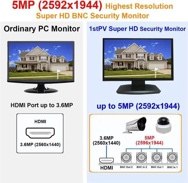 2. Super HD 5 megapixel (2592x1944) BNC resolution, which is 10 times higher than the Standard Definition (0.46MP/960H, 0.3MP/CVBS or VGA) BNC resolution from Normal CCTV/security monitors.