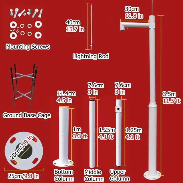 Security Camera Pole: The segmented column is made of 1.5 mm/ 0.06 in thick round galvanized steel pipe, cross arm (A-10 cm/ 3.9 in, B-28 cm/ 11 in, C-30 cm/ 11.8 in), with a diameter of 7.6 cm/ 3 in for the upper and middle columns and 11.4 cm / 4.5 in for the bottom column. It is UV-resistant, rust-proof, wind-proof, and resistant to high and low temperatures