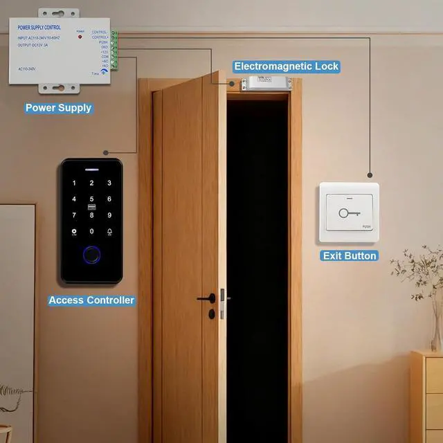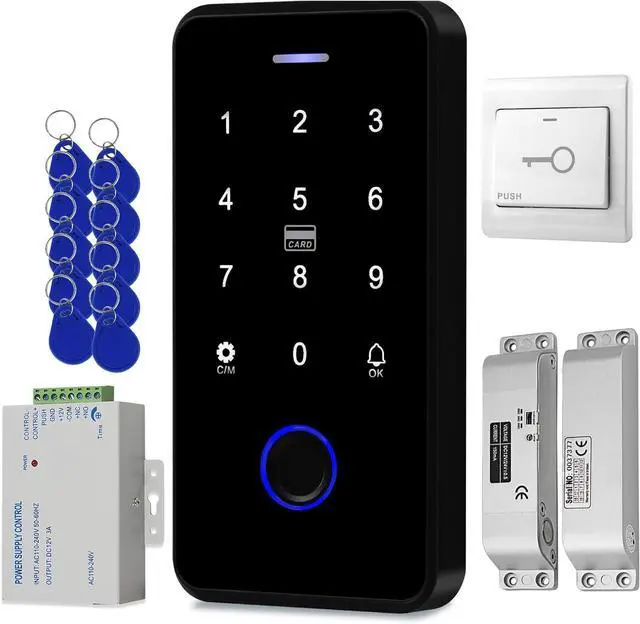 "5.Package Contents: 1 x Access Control Panel 1 x Power Supply 1 x Door Switch 1 x Surface-Mounted Electric Bolt 10 x 13.56 MHz IC Keychains (Blue) 1 xUser manual"
