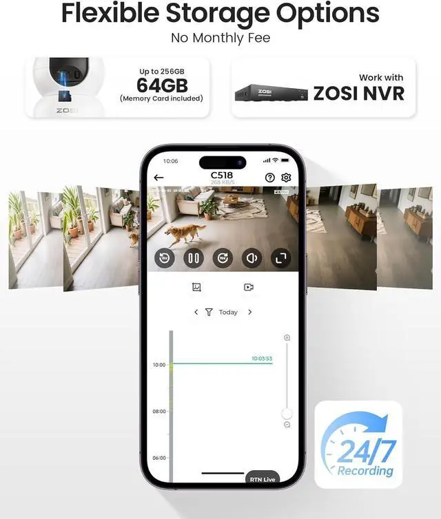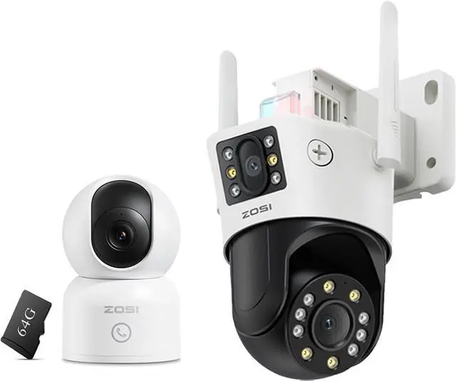 (5). [ Flexible Power, Storage & Remote Access ]__ Choose the setup that fits your needs: plug-in continuous power (4K indoor) or 2.4GHz WiFi IP66 weatherproof design for all-weather outdoor use (dual-lens). Store video locally via memory card (up to 256GB), on ZOSI NVR, or in the cloud. Manage, share, and playback footage anytime through the ZOSI Smart app.