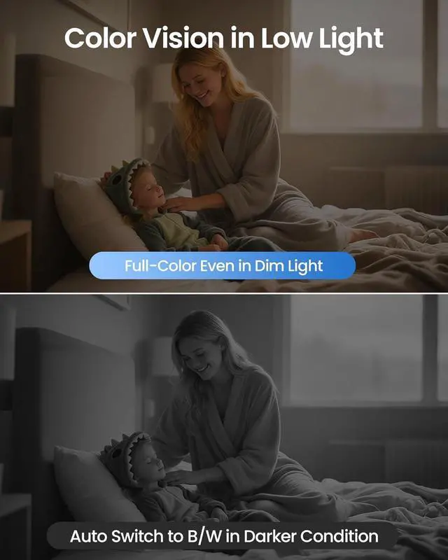 (4). [ Day & Night Clarity ]__ Enjoy vibrant full-color video even in low light. Smart night vision seamlessly switches between color and IR modes, with ranges up to 100ft (dual-lens) or 33ft (4K indoor). Both ensure sharp, detailed footage 24/7.