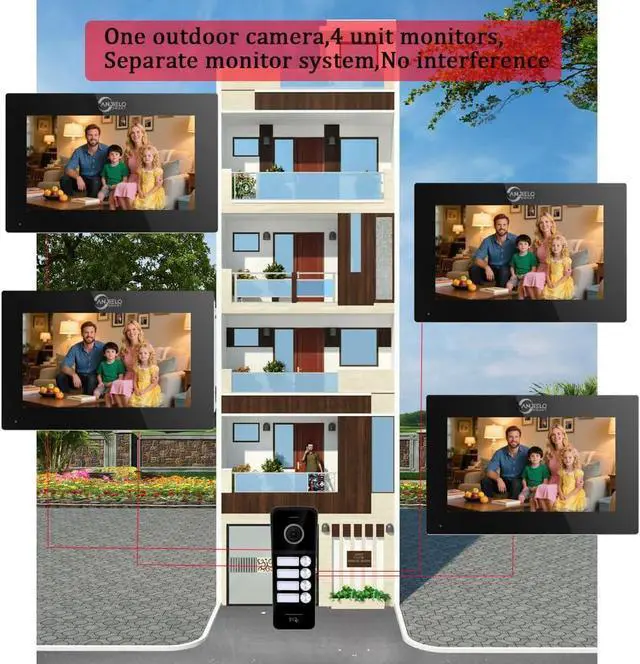 4 FAMILY UNIT DESIGN: 1 outdoor camera and 4 indoor monitor for visual intercom doorbell system, supports four occupants in one building. Individual monitors without interference.