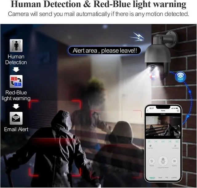 Red-Blue Warning Light Deterrent Visible flashing lights scare off intruders before incidents occur, adding proactive security.