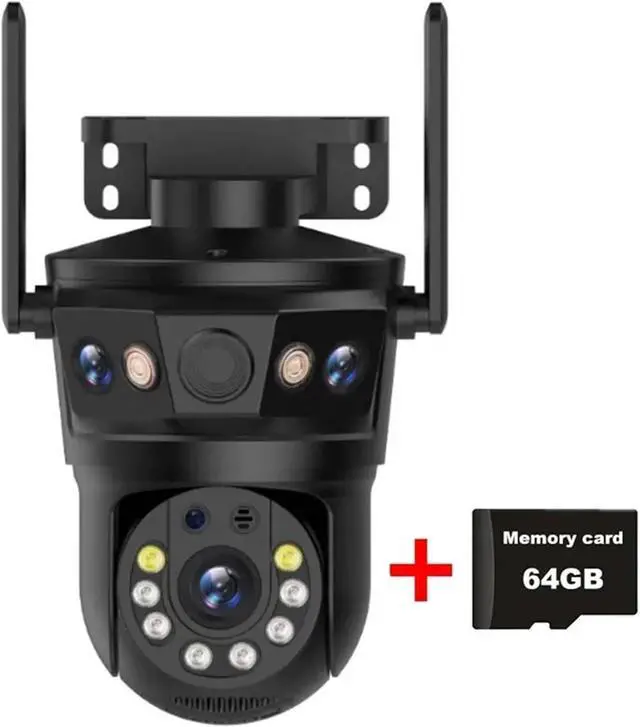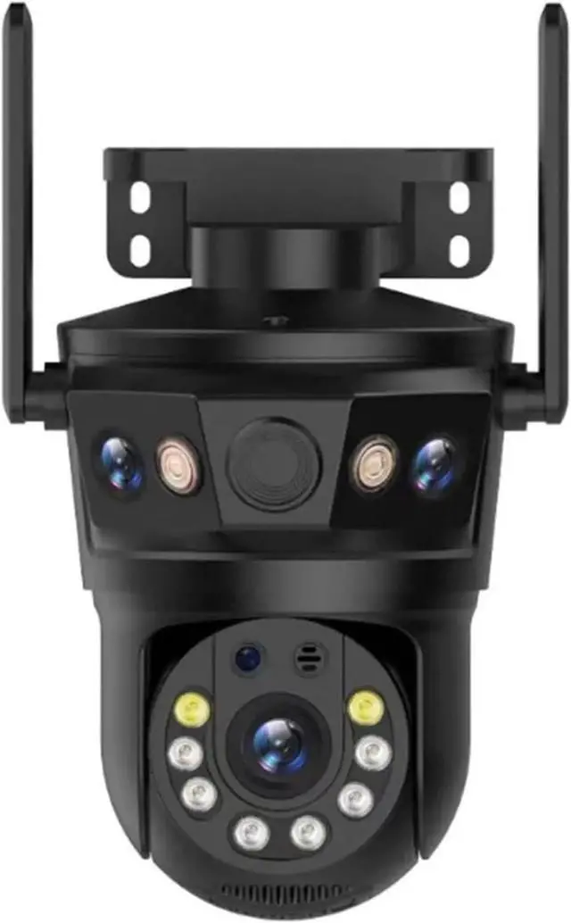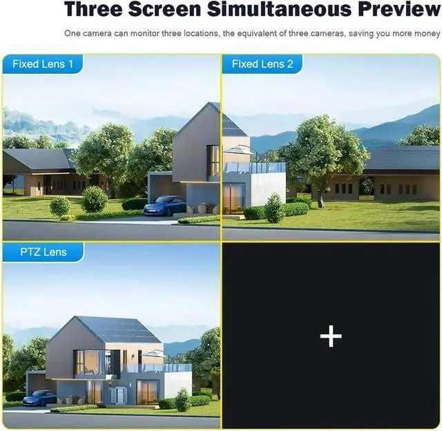 Three-lens three-screen design + 9MP ultra-clear, no blind spots in monitoring: Three 3MP lenses form a 9MP high-definition image quality. The three screens are synchronized for monitoring. The top dual lenses fix to cover a wide range, and the bottom lens can rotate 355° to track. Clicking on any position of the fixed picture canrotate the lens to focus on details. 360° no blind spot coverage one installation replaces multiple devices.