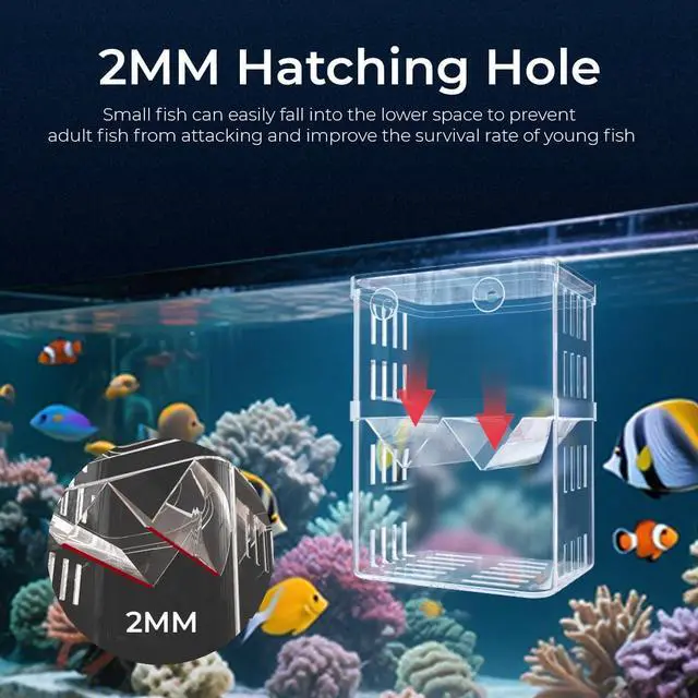 2 MM HATCHING HOLES & REMOVABLE GRATE: Precision-cut holes let newborn fry fall into the lower chamber for protection; the slotted grate keeps food residues and waste out.