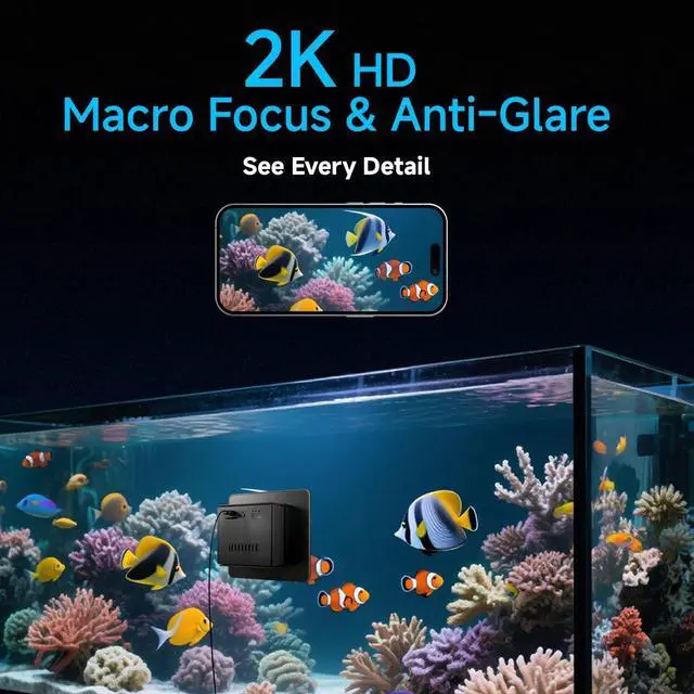 2K HD & ANTI-GLARE MACRO LENS: 3 MP sensor (2304 × 1296) captures crystal-clear close-ups of fish scales, plant details, and fry movements through glossy glass.