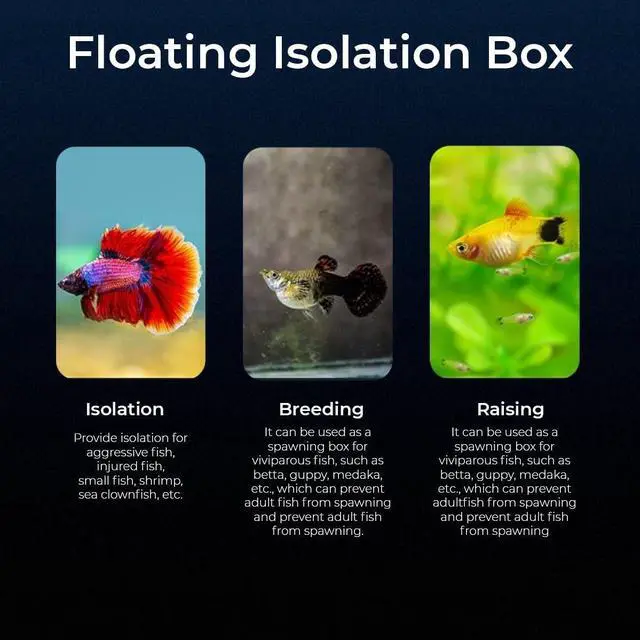 FLOATING ACRYLIC ISOLATION BOX: Safe, crystal-clear plastic incubator floats on the waters surfaceperfect for isolating fry, injured or aggressive fish, shrimp and clownfish.