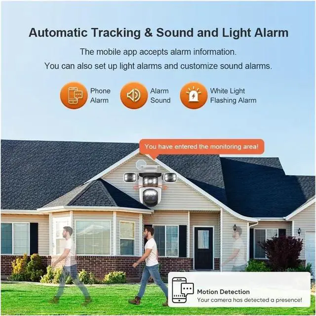Intelligent Security with Zero Blind Spots 24/7 all-weather motion detection. Once human activity is detected, it automatically focuses and tracks, and immediately triggers an alarm. 360° pan-tilt remote control, 355° viewing range, providing all-round protection for home security.