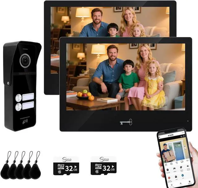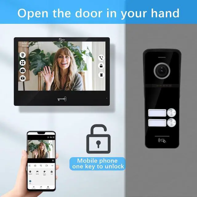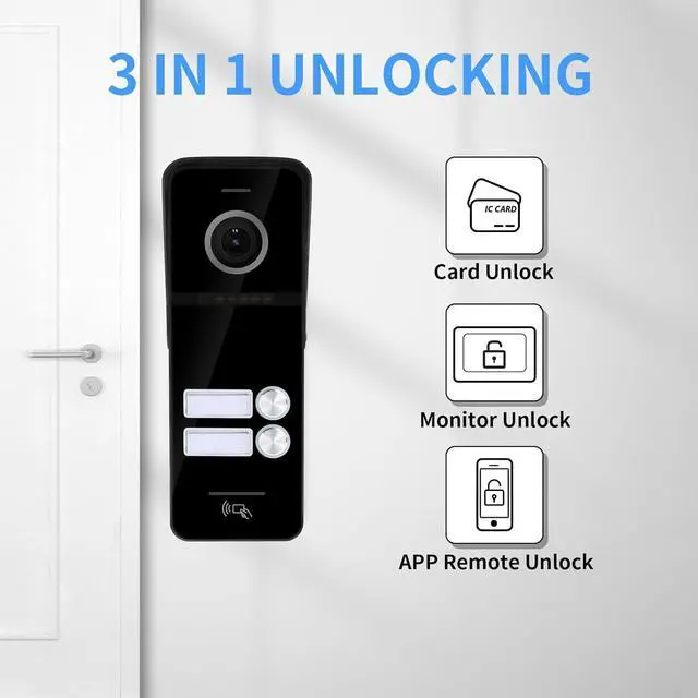 AUTOMATIC VIDEO RECORDING AND 3-in-1 UNLOCKING : The system offers three convenient unlocking methods: ID card recognition, mobile app control, and direct screen operation, catering to diverse usage scenarios. In terms of smart security, when the system detects abnormal movement, it automatically triggers video recording or snapshot functions. All records are stored on the monitor's built-in 32GB Micro SD card. Users can access monitoring records anytime via their smartphones, ensuring home security is always under control.