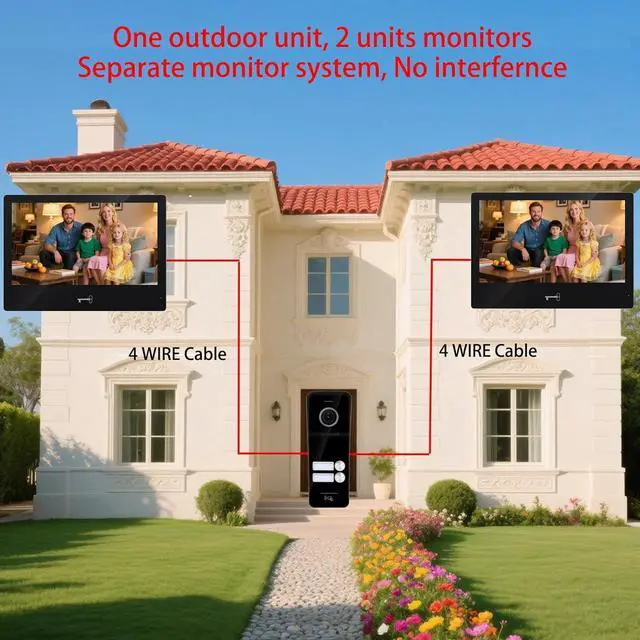 2 UNIT FAMILY DESIGN: This smart access control system adopts a 1+2 unit family design, comprising 1 outdoor doorbell and 2 10-inch indoor touchscreens, optimised for shared use by two households in the same building. Each device can work together or independently, ensuring that users do not interfere with each other.