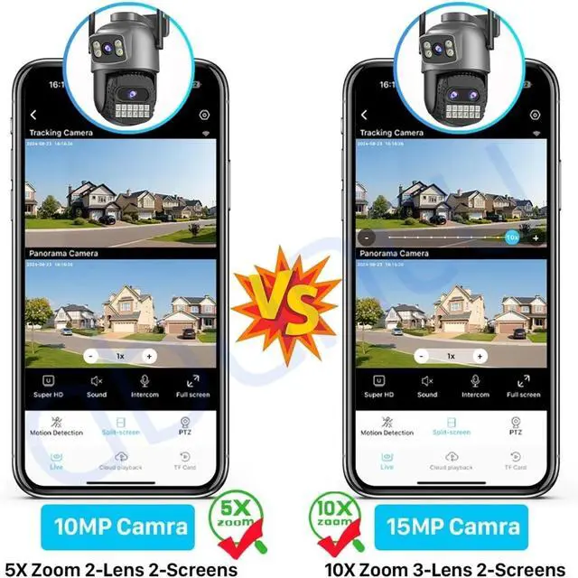 15MP Triple Lens + 10x Digital Zoom It adopts a triple lens combination (5MP+5MP+5MP) to achieve 15MP ultra-high-definition picture quality. Combined with 10x digital zoom, it can clearly capture details such as faces and license plates within 100 meters. The wide-angle and telephoto images are displayed simultaneously on dual screens, and the monitoring efficiency is 50% higher than that of traditional dual lenses. Large-scale scene refined monitoring is effortless.
