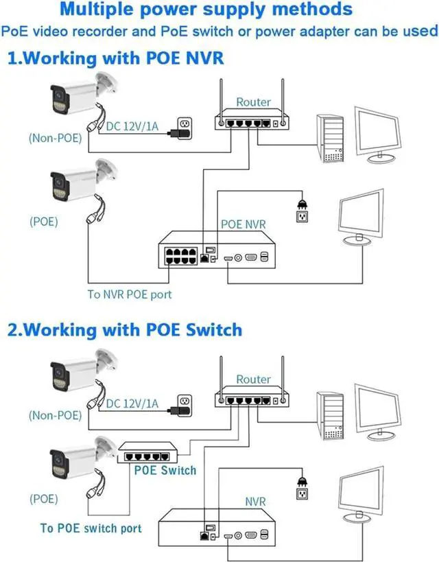 PoE/DC dual power supply + NVR compatibility, more flexible installation integration: supports 48V PoE power supply (one network cable handles both power and data) or 12V DC power supply, compatible with mainstream NVR systems, with simple wiring; remote preview and playback are convenient, suitable for upgrading security systems.
