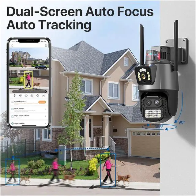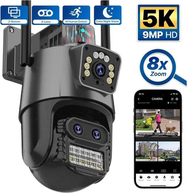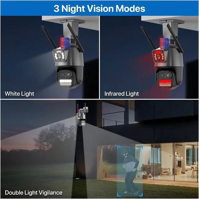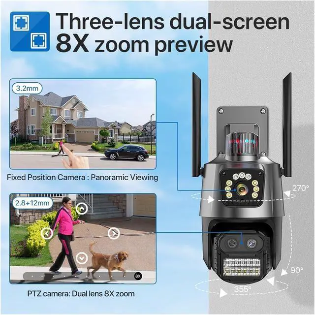 Triple Lens Dual View + 8x Zoom : The unique triple lens design enables the PTZ rotating lens and the fixed lens to work in coordination, supporting 8x digital zoom. Both near and far details are clearly visible, achieving all-round monitoring coverage without blind spots.