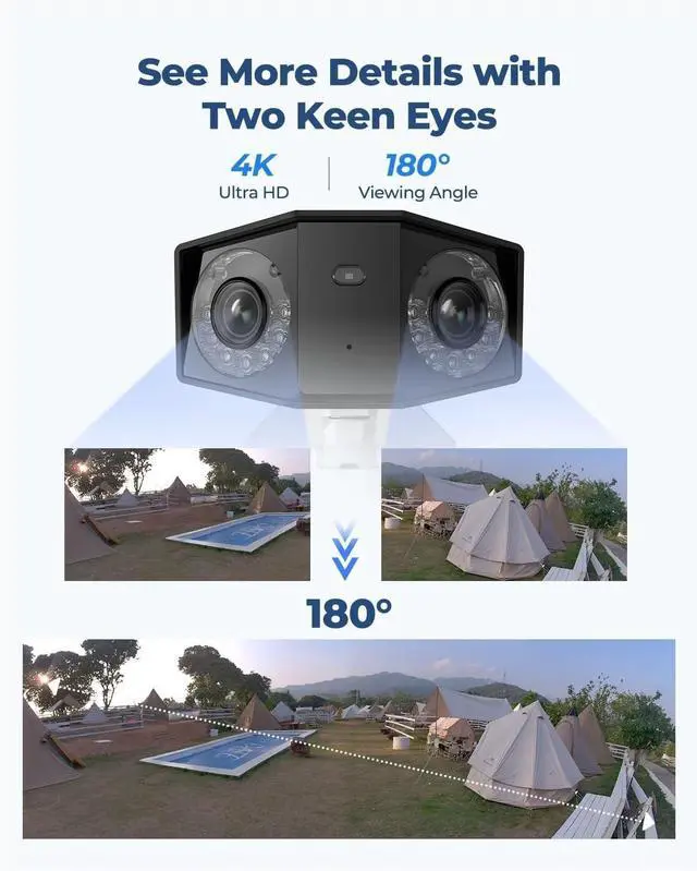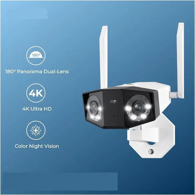 4K Ultra-high-definition Dual-lens Panoramic Monitoring : Seamless splicing of dual lenses for a 180° wide-angle field of view, with a resolution of 3840×2160, accurately captures details. License plates, faces and other distant targets are clearly distinguishable, and indoor and outdoor scenes can be seen at a glance.