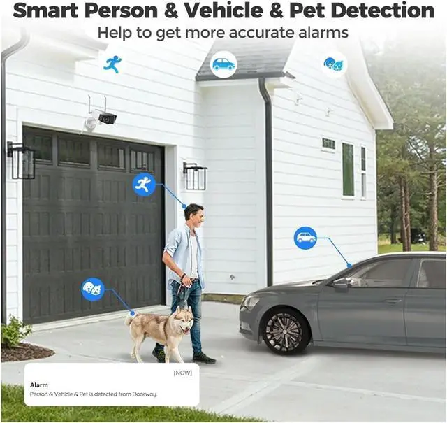 AI Intelligent Recognition + Three-mode Night Vision : Built-in algorithm automatically distinguishes between people, pets and vehicles to reduce false alarms; 8 fill lights + infrared LED support full-color night vision, infrared night vision and intelligent switching. It can present color images even in a completely dark environment, with 20-meter night vision coverage and no blind spots.