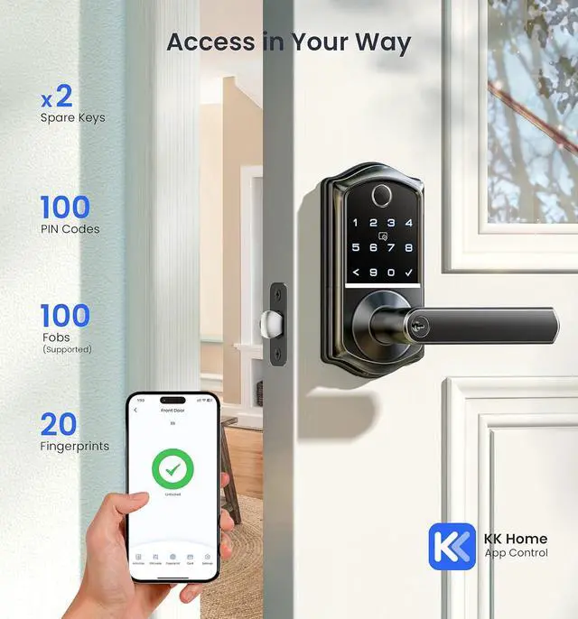 One Card Access & Locks Management: Use one card to unlock all authorized Veise door locks without carrying multiple keys or PINs. Manage all the locks and view lock activities by date via the KK Home App. Perfect for landlords with multiple properties