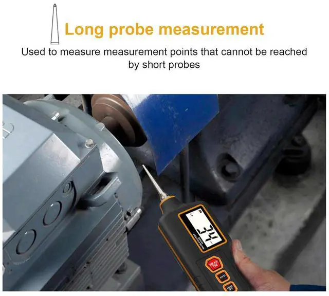Extendable Probe Access: 300 mm stainless steel probe reaches motor bearings and confined spaces; Interchangeable tip design accommodates flat/needle attachments for gearbox or conveyor belt measurements