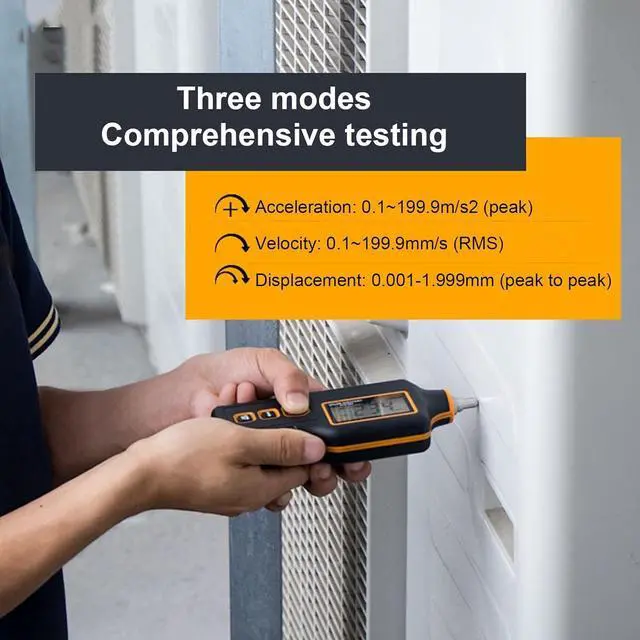 Triple-Parameter Vibration Analysis: Measures acceleration (0.1-199.9m/s² peak), velocity (0.1-199.9mm/s RMS) and displacement (0.001-1.999mm p-p) simultaneously; ±5% accuracy meets ISO 2954 standards for industrial condition monitoring