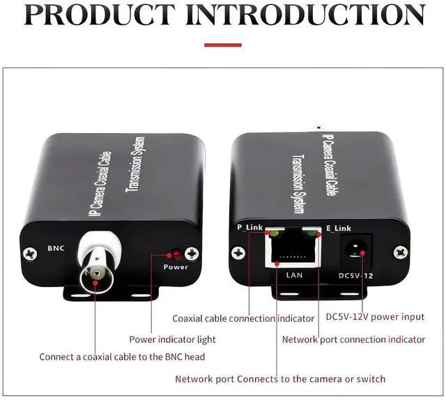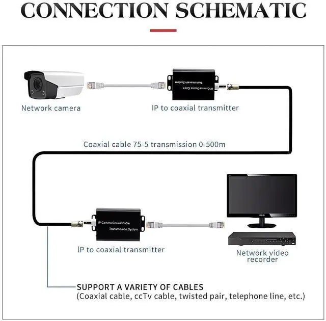 TRANSMISSION RANGE: Supports long-distance transmission up to 500 meters via 75-5 coaxial cable, with RJ45 interface supporting cat5e/6 network cable up to 100 meters