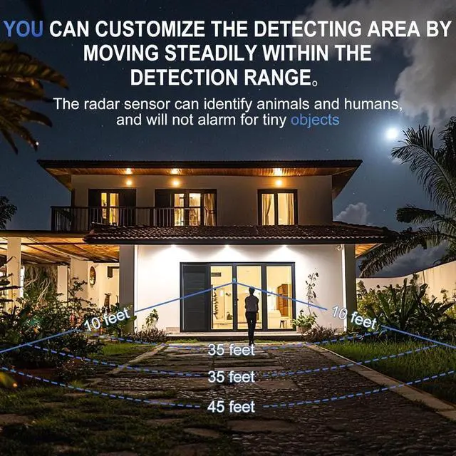 Customizable Detection ZonesSet your own detection range by walking the area and pressing the setting button. Covers up to 45 ft forward and 10 ft to the sides. Perfect for driveways, pathways, gates, garages, yards, warehouses, and outdoor perimeter security