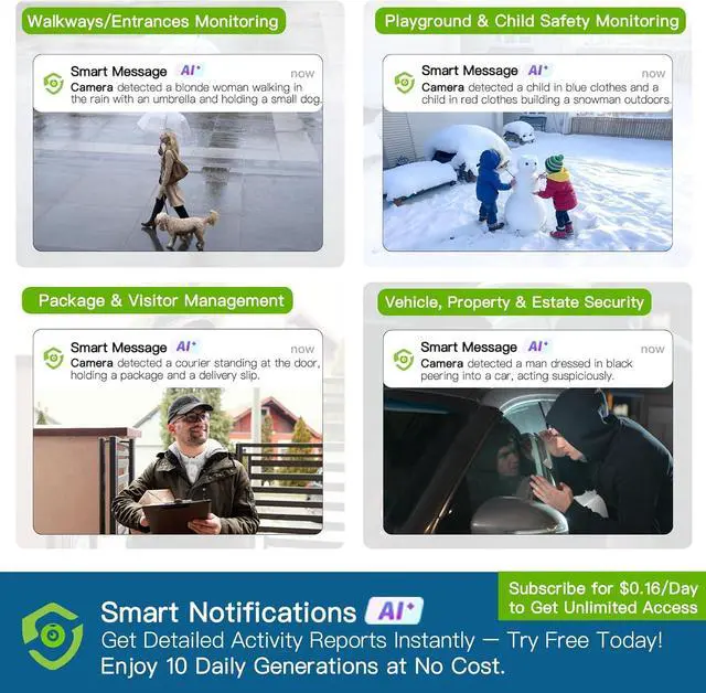 AI Motion Detection, PIR Heat Sensing & Human Detection: Cameras for home security outside with AI and PIR technology identifies humans, vehicles, animals, reducing false alarms by 99%. Captures HD video, enables two-way talk, sends real-time app alerts. AI triggers alerts for human presence only. Features motion alarm, auto spotlight, and security to deter intruders