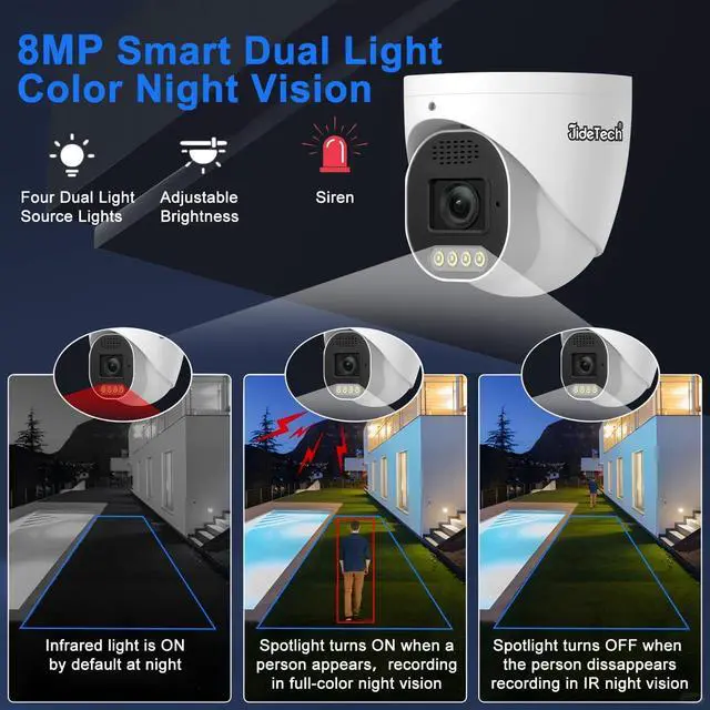 Smart Dual-Light Color Night Vision: This 4k IP camera poe lens is equipped with four incandescent lights underneath it, which will light up when people or vehicles are detected at night, provide clear, colorful and detailed video. You can also customize your night vision mode based on your specific needs, choose between infrared night vision and continuous color night vision mode. night-vision up to 98ft.