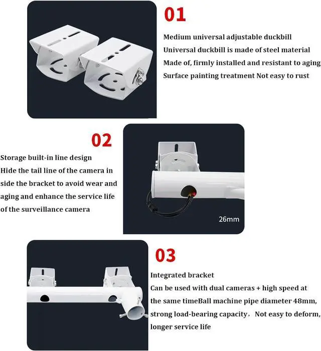 3. Monitoring bracket: The cable can be hidden inside the bracket without fear of wear and aging, thereby increasing the service life of monitoring; The security camera mounting bracket is designed for large-size cameras such as pan-tilt domes installed in the corners of the exterior walls, with good stability. It can be matched with dual cameras at the same time.