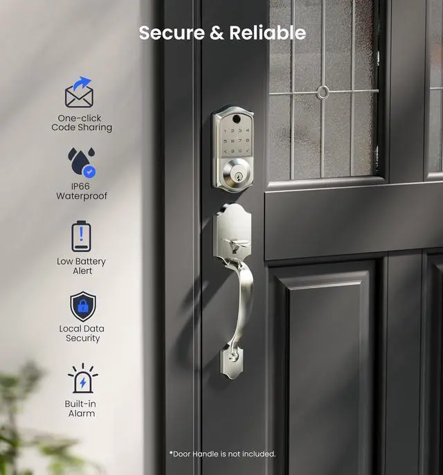 Durable & Secure: Meets ANSI Grade 3 & BHMA standards; IP66 waterproof, withstands extreme temps (-35 to 160), with low battery alerts, USB-C emergency charging and safe mode to ensure home security