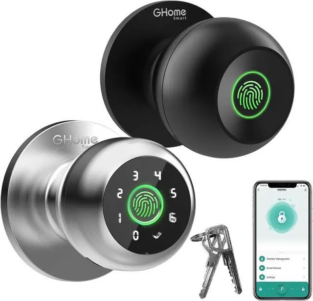 Keyless Entry Door Lock for BedroomWith Ghome Smart door lock, experience the convenience of multiple unlocking methods: fingerprint recognition (stores up to 20 fingerprints), personalized passwords (20 available), app control (remote within Bluetooth range), and mechanical keys for emergencies. This fingerprint door lock with keypad ensures seamless access for family members and guests.