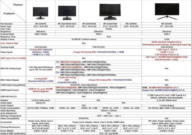 1. 19.5" Super HD MT-G3D195HD-ECO 5MP/2592x1944 over Coax LED Security Monitor. 1 HDMI & 2 Super HD BNC Video Inputs. BNC video-in port works directly with the new Super HD security cameras without going through any DVR or converters. It will allow security cameras send clear video by using a single Coax cable to the HD monitor, and it can prevent fuzzy or unclear images between the camera, recorder, and monitor. And 1 BNC Video Outputs for Second Monitor. Comprehensive range of Super High Definition product line, including cameras, DVRs/NVRs, and Super HD monitors.