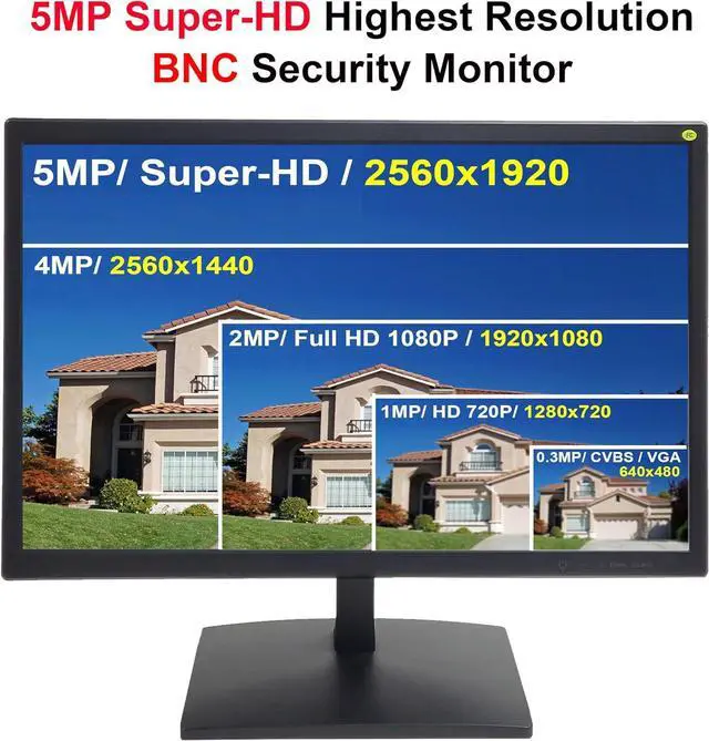 2. Super HD 5MP security monitors with BNC inputs allows them to be connected directly to the new super HD up to 5MP/2592x1944 resolution cameras for the much clear and more accurate video feed. And it is 10 times higher than the Standard Definition (0.46MP/960H, 0.3MP/CVBS or VGA) BNC resolution from Normal CCTV/security monitors. Support up to 5MP/2592x1944 Super HD-TVI, HD-AHD, and 4MP HD-CVI.