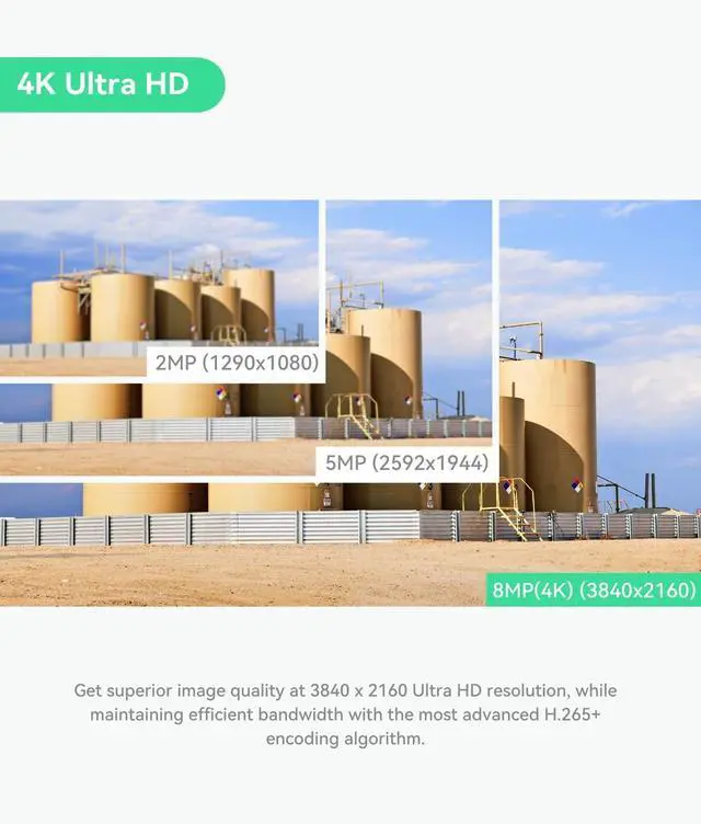 4K ULTRA HD - Presenting 8 Megapixels (3840x2160) vivid video wth 4x more details than regular HD camera; wide view angle; Efficient bandwidth control with the advanced H.265 compression;