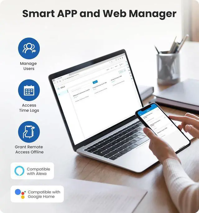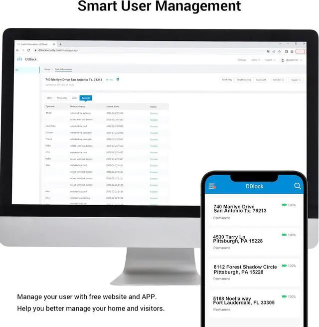 APP Management: Free Website and App for seamless user and door lock management. You can set passwords, manage access rights and view access logs