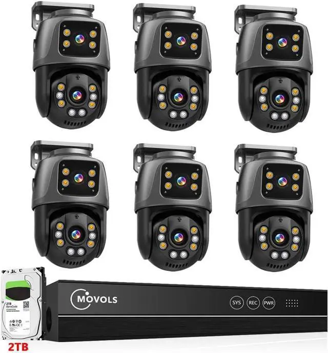 Dual Lens Security Camera with 2TB HDDMovols outdoor PoE security camera system with dual 3.6mm lenses: bullet camera and dome camera provide 360° angle coverage and truly dead-angle free 2-screen UHD images. Built in 2TB HDD gives you a long video retention time(maximum supports 10TB HDD),24/7 recording security camera with non-stop surveillance by this wired security camera system. the Video files can be stored up to 60 days. All video data are encrypted and saved locally, no monthly fees.
