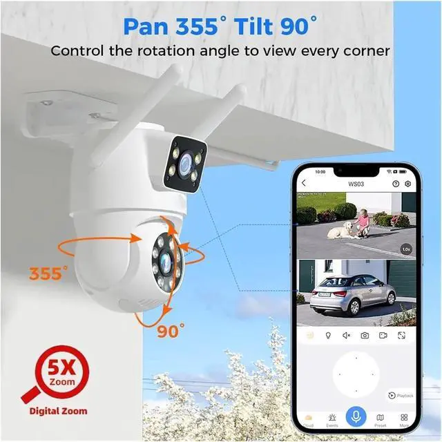 1. **Double Lens Intelligent PTZ, Surveillance without Dead Angle** Adopting double lens design, it supports wide-angle and long-distance surveillance, with 355°horizontal rotation and 90°vertical rotation function, covering the monitoring area in all directions. Intelligent PTZ technology can automatically track moving targets to ensure that the surveillance focus is always locked, guarding more accurately.