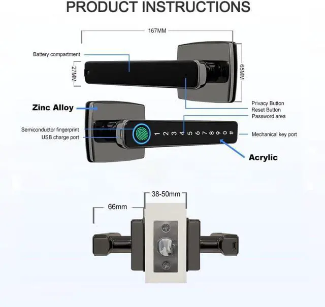 Robust construction Our door lock fingerprint is made of zinclegation material and is designed in such a way that it withstands the test of time and contradicts the manipulation. This robust construction ensures that it can endure a number of environmental elements, which is suitable for both interior and use outdoors. Driven by four AAA batteries (not included) You will be reassured when you know