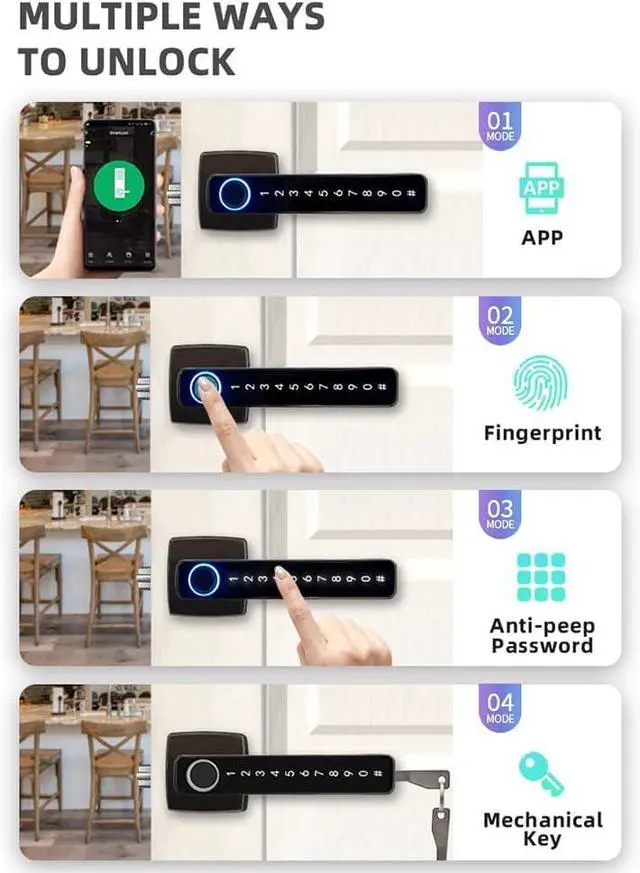 4-in-1 unlocking method Experience the comfort and safety of our advanced door lock fingerprint, which offers four different unlocking methods: fingerprint detection, password input, traditional key access and app control. This innovative design is suitable for different preferences and situations and ensures that you always have access to your house or space