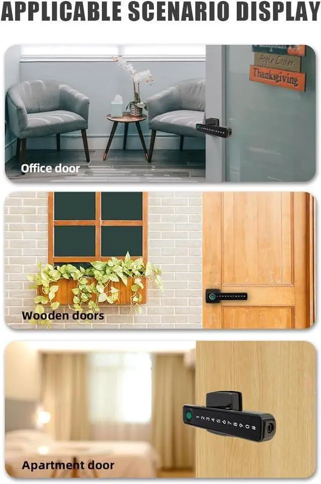Applicability The door lock fingerprint measures 145 x 65 x 25 mm and is for a variety of applications, including front doors, bedrooms, apartments, hotels and much more. Its adaptability makes it possible to achieve different door thicknesses in the range of 1.49-1.96 inches, which makes it a varied choice for every place