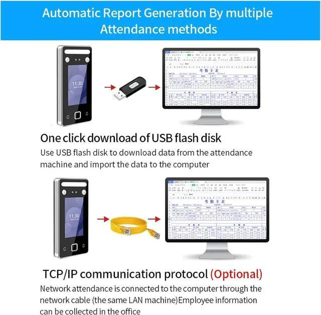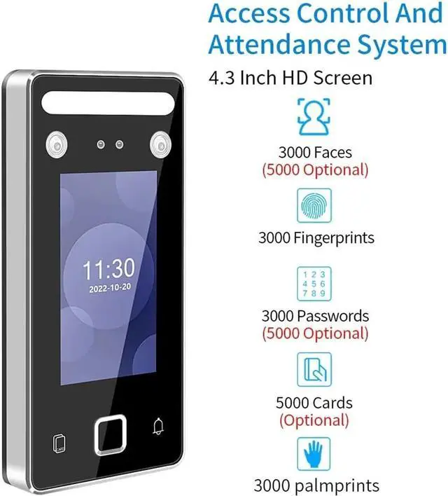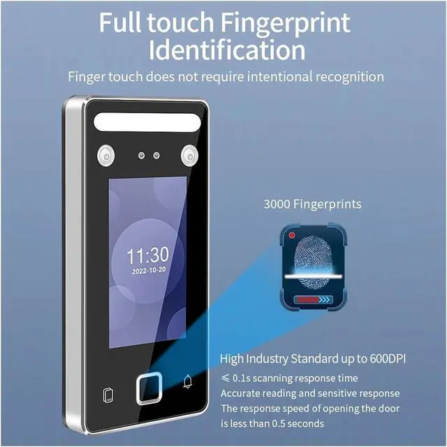 5. Advanced features and specifications: With a high face recognition distance, 1 million infrared + 1 million color imported WDR binocular camera, and fast recognition speed, our Attendance Machine ensures accurate identification. It also offers powerful access control functions and supports attendance report export.