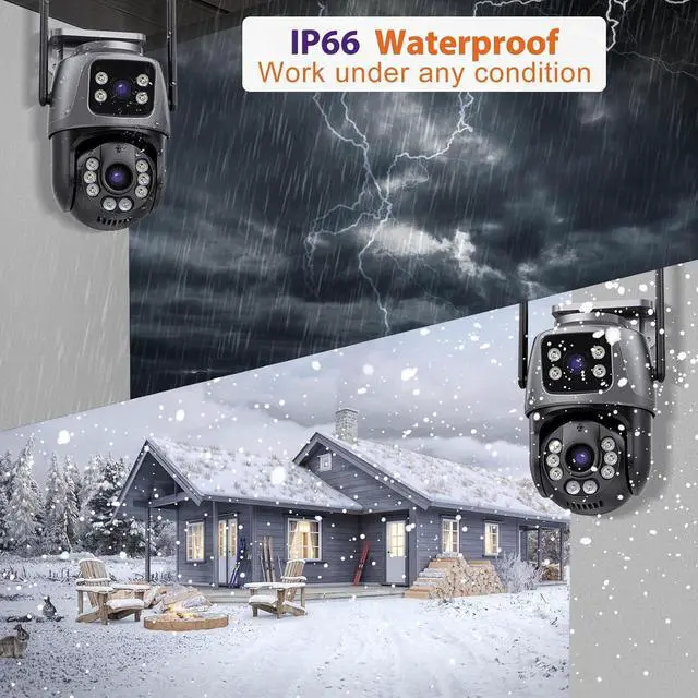 Comprehensive Protection: Equipped with lighted alarms, two-way audio, AI detection, auto-tracking, and smart alerts, all your security needs. Easy to install and setup, IP65 waterproof rating to withstand rain and snow. Outside camera wireless for car parks, warehouses
