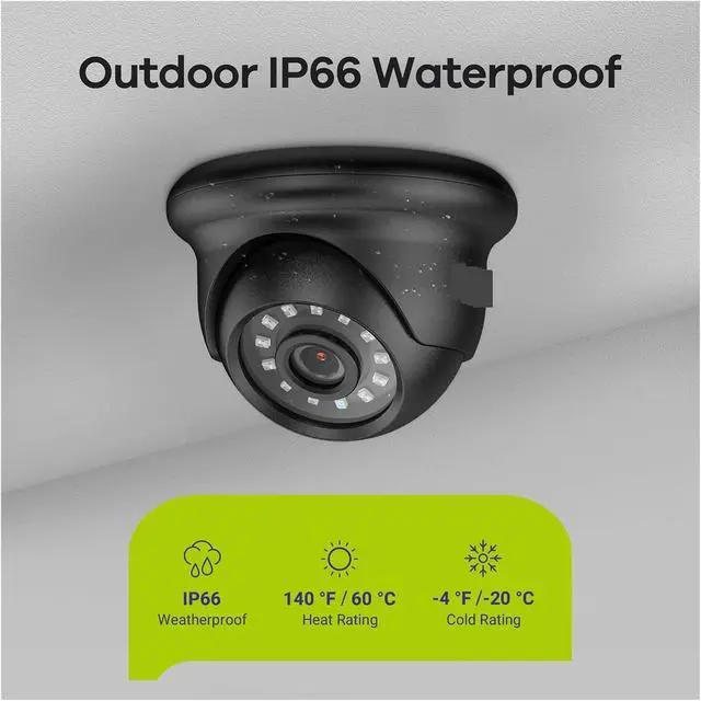 IP66 Waterproof & DustproofThe security camera is for indoor and outdoor use It withstands most unforgiving weather conditions such as rain, snow, sleet or wind, and extreme temperature from -40 °F to 140 °F.