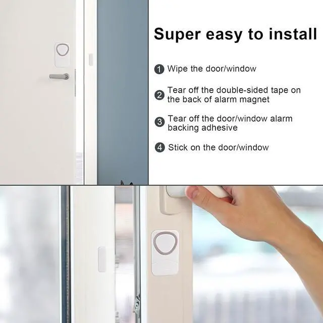 Easy to InstallThe door open alarm installation operation is simple and does not require the use of any special tools. Door alarm sensor can be install at home in a few minutes, simply stick double-sided adhesive onto the sensor, select a suitable location, and stick it onto the door or window to use it directly.