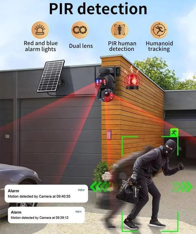 PIR Motion Detection & Realtime Alerts: Built in high sensitivity speakers and advanced PIR detection sensors, once human movement is detected, the wireless home security camera will immediately push alarm information to your phone and trigger a loud siren, spotlight, or sound alarm to scare away unwanted visitors