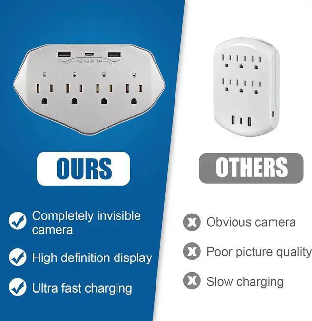 1. **Discreet Hidden Camera Design** Camouflaged as a fully functional power outlet with seamless integration into home office and business for security purpose. Critical for nanny cams, seniors or pets monitoring