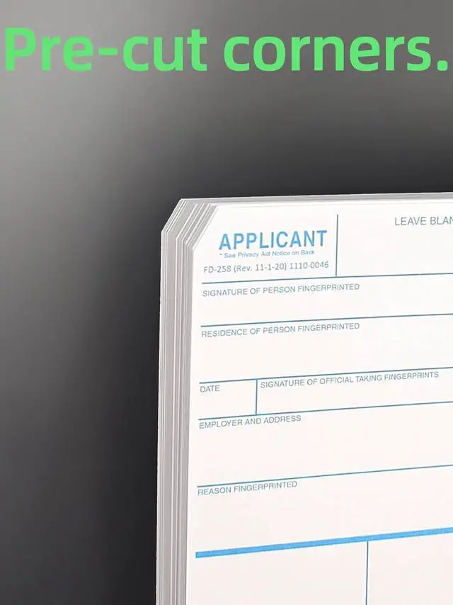 Standard FBI FD-258. Version: 11-1-20 Cards come in packs of 250 Double-sided printing. What you see is what you get, with a notch in the upper left corner. Excellent ink absorption for clear finger print impressions.