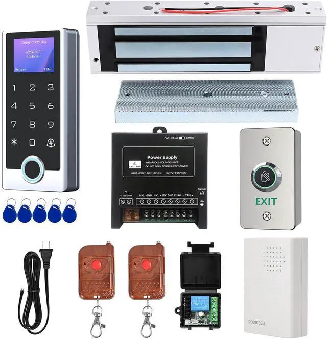 Complete Access Control Kit - Includes stainless steel keypad, 1200lb electromagnetic lock, power supply control, waterproof exit button, remote controls, doorbell, and power cord - everything you need for a full door access system.