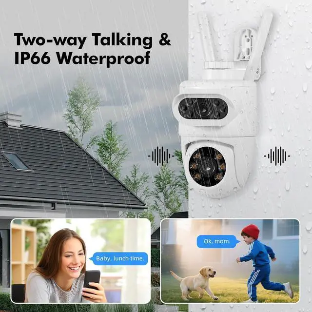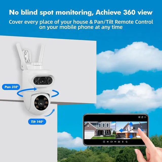 360° Full Coverage & Dual Screen Synced Monitoring:Our cameras for home security with dual lenses, Combines one fixed lens and one Pan Tilt Zoom (PTZ) lens for a seamless 360° view. Dual integrated screens enable simultaneous multi angle viewing, significantly boosting monitoring efficiency and area coverage