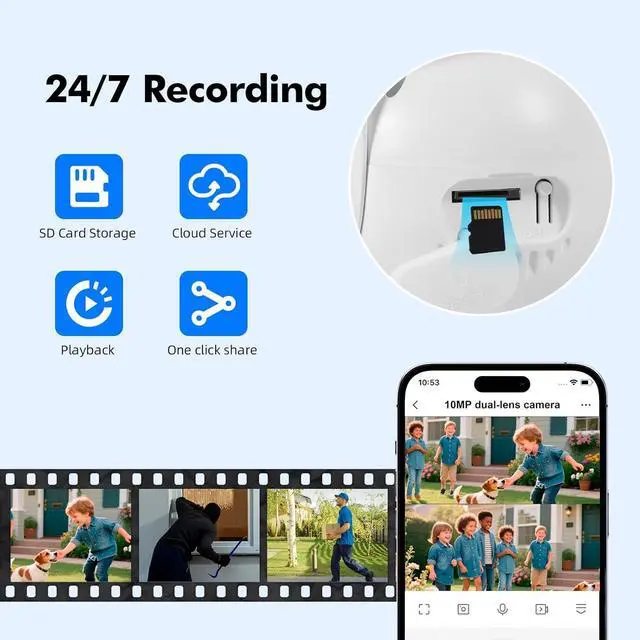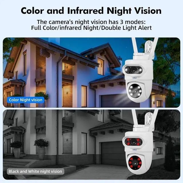 10MP HD Clarity & Triple Night Vision Modes:Security camera outdoor dual lenses deliver stunning 10MP (5MP + 5MP) HD resolution day and night. Features Full Color, Infrared, and Smart Auto night vision. Auto activating white/IR lights ensure clear, color images in low light up to 65ft