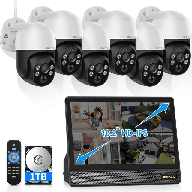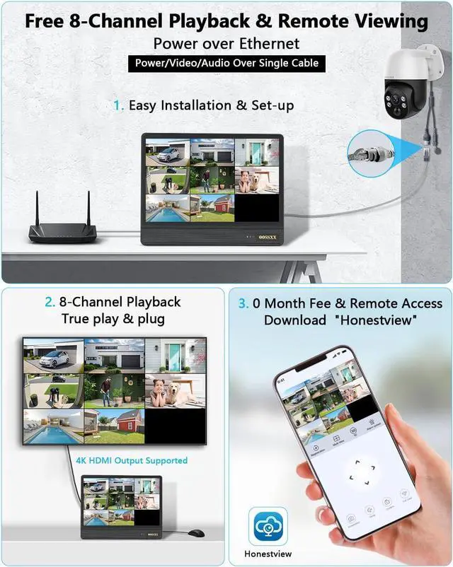 {All-in-One 10 HD Monitor} This 4K PoE security camera outdoor supports add up to 8 cameras up to 8MP/4K resolution. And wied outdoor cameras for home security comes with 1TB (up to 6TB). The 10 Inch Large Screen NVR provides you with Ultra Clear Video at the level of a Laptop Screen. {Auto-Track PTZ Camera System} The surveillance camera system has PTZ cameras that features Auto-Track . Mount the cameras of different sides of your property to cover it all. The cameras automatically track people, animals and vehicles, and automatically return to settable home point. {PTZ 360° Coverage} PTZ outdoor camera, you can pan, tilt and digital zoom. The camera rotates 355° with a tilt angle of -15° to 90°. The poe camera offers 5x Digital zoom. Day and night to protect your family. {2-Way Audio} You can keep in touch with your family when you miss them and want to talk to them anywhere and anytime. This security camera supports multiple users(up to 4) to view streaming video simultaneously. You can remotely live view or chat by high-quality two-way audio via APP. Just download the free Eseecloud APP from APP Store (IOS) or Playstore (Android) on smart-phone. {130° Ultra Wide-Angle Lens Equipped} Optical wide-angle lens with multi-layer lens, provides you about 130° wide viewing angle and reduces dead ends of surveillance areas. {4K Ultra HD} Super HD 8.0MP cameras Capture crystal clear videos day & night. The 4pcs infrared array LEDs allow you to get high-quality night vision up to 90ft, helping you to protect your property even at night. {Plug and Play PoE System} The camera kit comes with 60ft network cables, which allows for easy installation and set-up. After connecting the security cameras to the NVR ports, recording and live views can be seen within seconds via an HDMI monitor. {Free APP No Month Fee} Download the free app "Honestview" from App Store on your smartphone. With an internet connection, you can watch the videos remotely from anywhere on your phone (IOS&Android), PCs, or tablet.