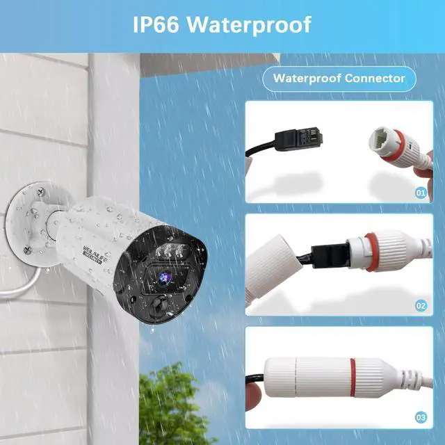 Dual Power Supply Mode WEILAILIFE wired security camera system features dual power options, including Ethernet and power connectors for enhanced flexibility. While the standard PoE Ethernet cable transmission distance is 60 meters, using the power connector allows for a local power supply near the camera, extending the range of the video security system to over 200 meters (about 660 feet). This setup improves the stability and coverage of the outdoor security camera system, increasing the transmission distance by more than three times compared to using Ethernet alone.